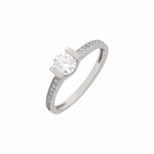 Γυναικείο δαχτυλίδι μονόπετρο σε λευκό χρυσό 14 καρατίων διακοσμημένο με λευκή πέτρα ζιργκόν στο κέντρο του και μικρότερα ζιργκόν να κοσμούν τη γάμπα του.