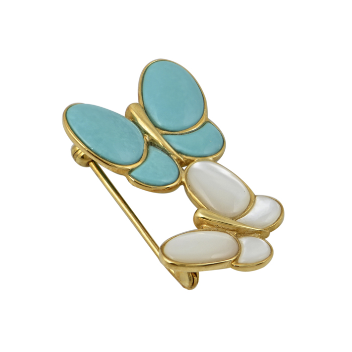 Καρφίτσα διπλή πεταλούδα κίτρινος χρυσός Κ18 με φίλντισι και τυρκουάζ