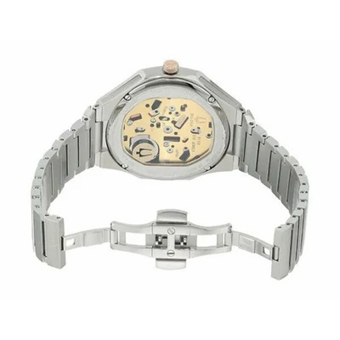 Unisex ρολόι bulova 98P182 curv με ασημί καντράν διακοσμημένο με 4 διάμαντια και μπρασελέ από ανοξείδωτο ατσάλι.
