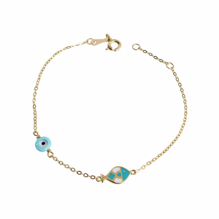 Παιδικό βραχιόλι με σχέδιο ψαράκι από κίτρινο χρυσό 14 καρατίων και μπλε ματάκι.