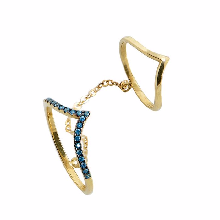 Γυναικείο δαχτυλίδι διπλό σε κίτρινο χρυσό 14 καρατίων διακοσμημένο από τυρκουάζ ζιργκόν με αλυσίδα που ενώνει τα δύο δαχτυλίδια.