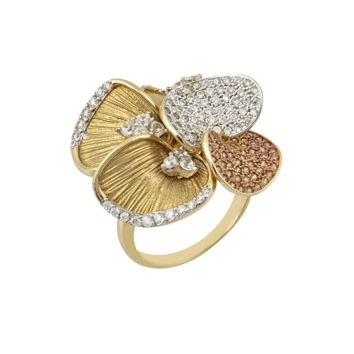Δαχτυλίδι λουλούδι, λουστρέ, τρίχρωμο, λευκό, ροζ και κίτρινο χρυσό Κ14 με λευκά ζιρκόν