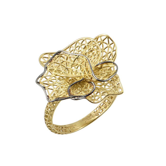 Δαχτυλίδι λουλούδι πλεχτό σε κίτρινο χρυσό Κ14 με λεπτομέρεια μαύρο πλατίνωμα