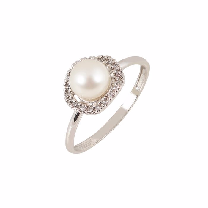 Γυναικείο δαχτυλίδι ροζέτα σε κίτρινο η λευκό χρυσό 14 καρατίων με μαργαριτάρι στο κέντρο του περιτρυγιρισμένο με λευκές πέτρες ζιργκόν.