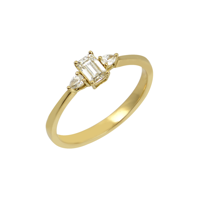 Δαχτυλίδι σε κίτρινο χρυσό κ18.Ένα διαφορετικό και ιδιαίτερο μονόπετρο για να πετύχετε το ‘Ναι’.Στο κέντρο του έχει 1 διαμάντι σε baguette 0.33ct και πλάι το στολίζουν 2 διαμάντια σε pear shape στα 0.08ct.