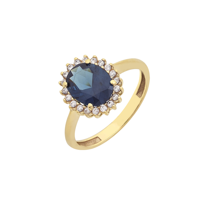 Δαχτυλιδι σε κίτρινο χρυσό Κ14 σε σχέδιο ροζέτα με μπλε κέντρο και λευκά ζιργκόν