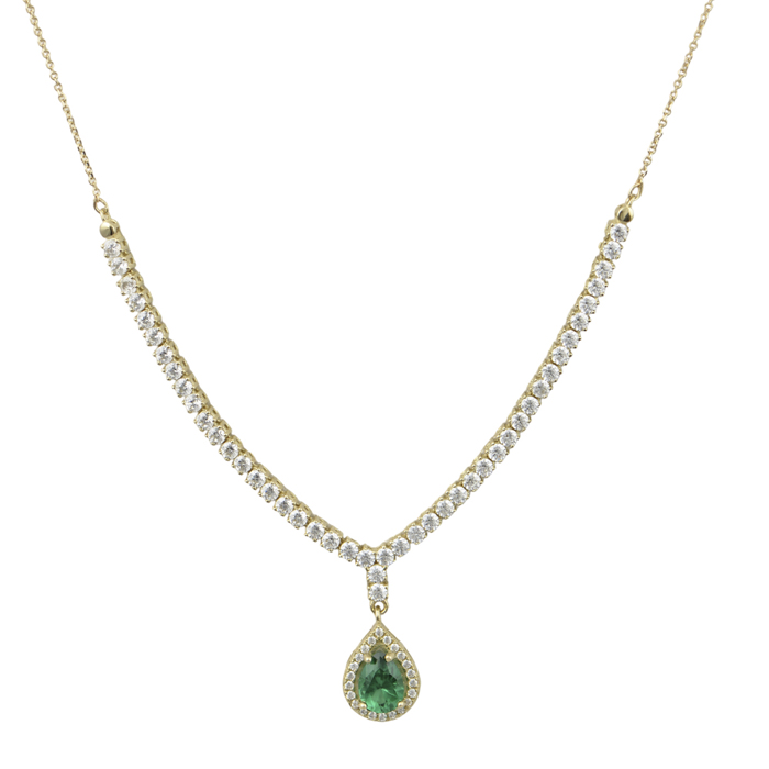 Κολιέ κίτρινο χρυσό με σχέδιο ριβιέρα με πράσινη ροζέτα σε σχέδιο αχλάδι και λευκά ζιργκον