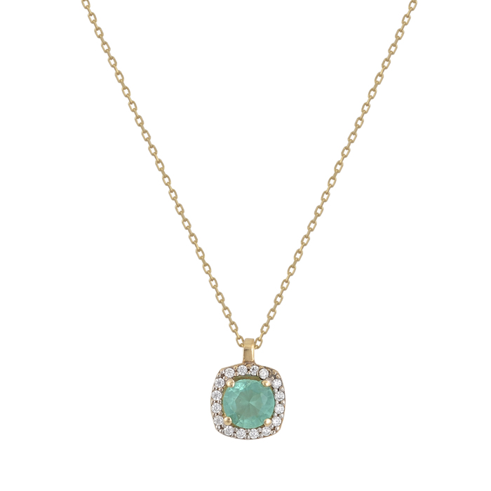 Κολιέ κίτρινο χρυσό Κ14 με σχέδιο τετράγωνη ροζέτα με γαλαζοπράσινο κέντρο και ζιργκον