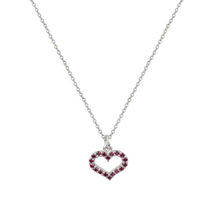 Γυναικείο κολιέ με μοτίφ σε σχήμα καρδιά από λευκό χρυσό 14 καρατίων.Είναι στολισμένο με κόκκινα ζιρκόν.Το ύψος του μοτίφ είναι 1cm ενώ το μήκος της καδένας είναι 41cm.Ένα δώρο για το αγαπημένο σας πρόσωπο!
