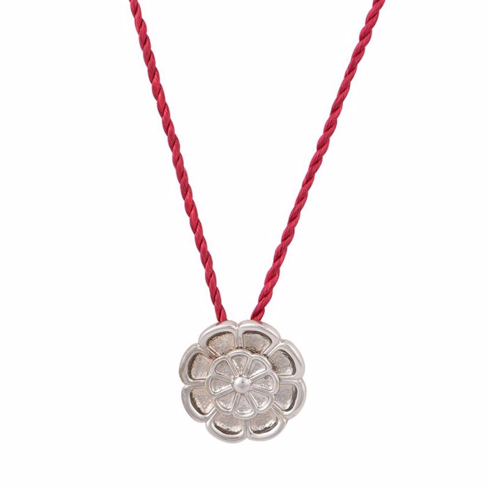 Γυναικείο κολιέ με μενταγιόν ρόδακας 2.8cm από ασήμι 925 με κόκκινο μεταξωτό κορδόνι. Ρόδακας ένα αρχαίο σύμβολο μυστικισμού και των ελευσινίων μυστηρίων. Αποτελεί ένα σύμβολο αναπόσπαστο κομμάτι της ελευσινιακής κληρονομιάς.