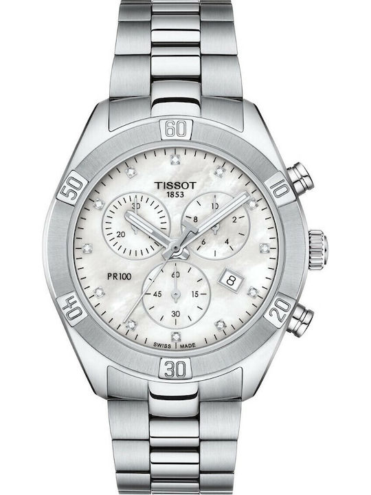 Γυναικείο ρολόι tissot T101.917.11.116.00 pr 100 sport chic chronograph με λευκό φίλντισι καντράν και μπρασελέ από ανοξείδωτο ατσάλι.