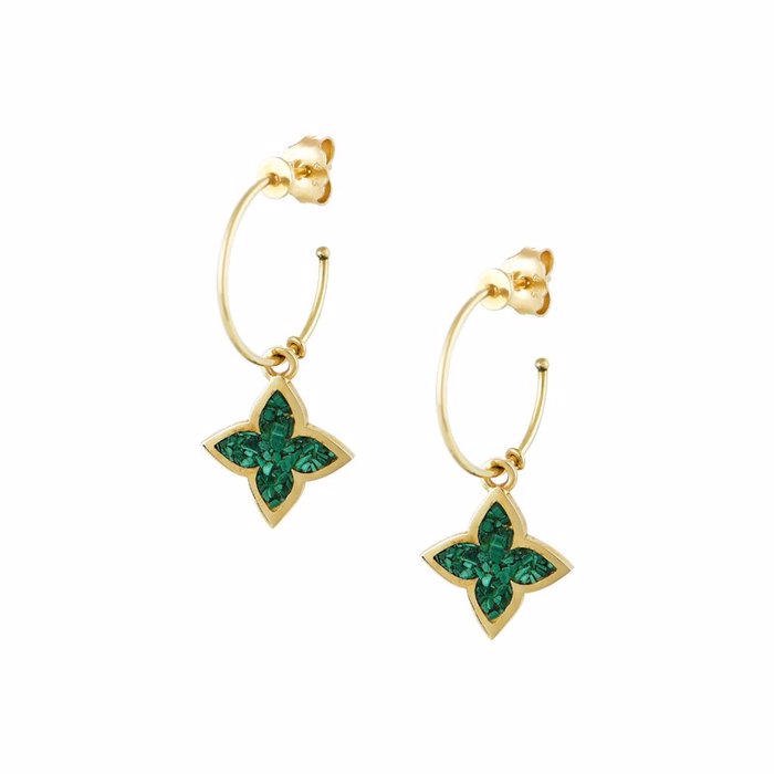 Γυναικεία σκουλαρίκια κρίκοι από κίτρινο χρυσό 14 καρατίων με κρεμαστό σταυρό διακοσμημένο με μωσαικό αχάτη.