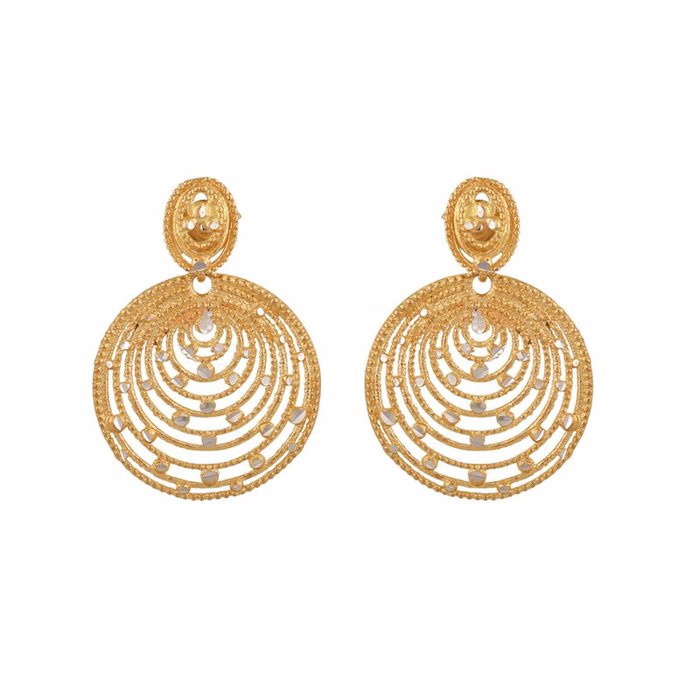 Γυναικεία σκουλαρίκια κρεμαστά από κίτρινο χρυσό 14 καρατίων με σχέδιο κύκλους διακοσμημένα με λευκές πέτρες ζιργκόν.