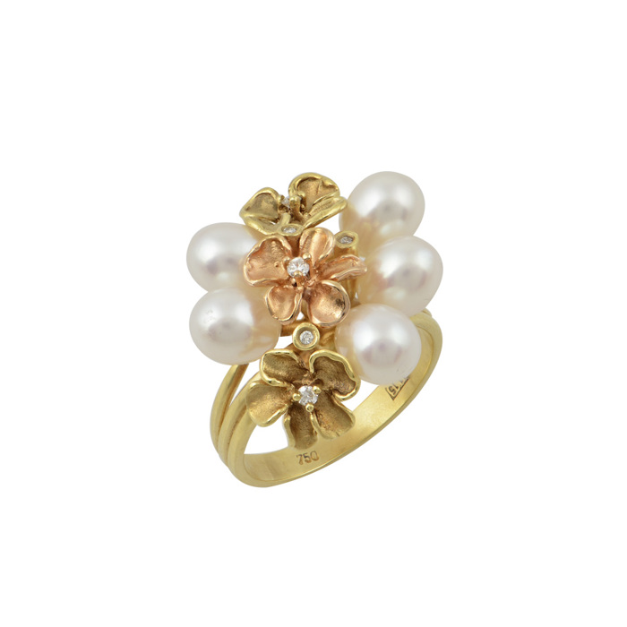 Δαχτυλίδι Χειροποίητο με λουλούδια, λουστρέ, σε δίχρωμο, κίτρινο και ρόζ χρυσό Κ18 .Ένα εντυπωσιακό και μοναδικό κόσμημα με 3 διαμάντια και και 6 λευκά μαργαριτάρια που σίγουρα θα σας συνοδεύει στις ομορφότερες στιγμές της ζωής σας!